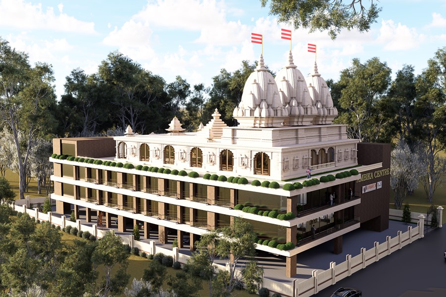 "Thrilled to share the latest renderings of the Ambika Centre, a unique spiritual and community hub we designed for the Netherlands. This project seamlessly integrates traditional Hindu temple architecture, featuring the distinct shikhara domes and flags, with a modern, multi-story structure. The design addresses the need for both sacred space and functional facilities, including community areas and parking. The use of natural brick tones, extensive glazing, and lush rooftop landscaping ensures the building harmonizes with the surrounding landscape while standing as a proud spiritual landmark."
